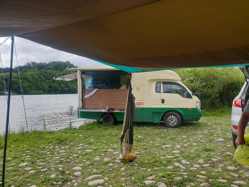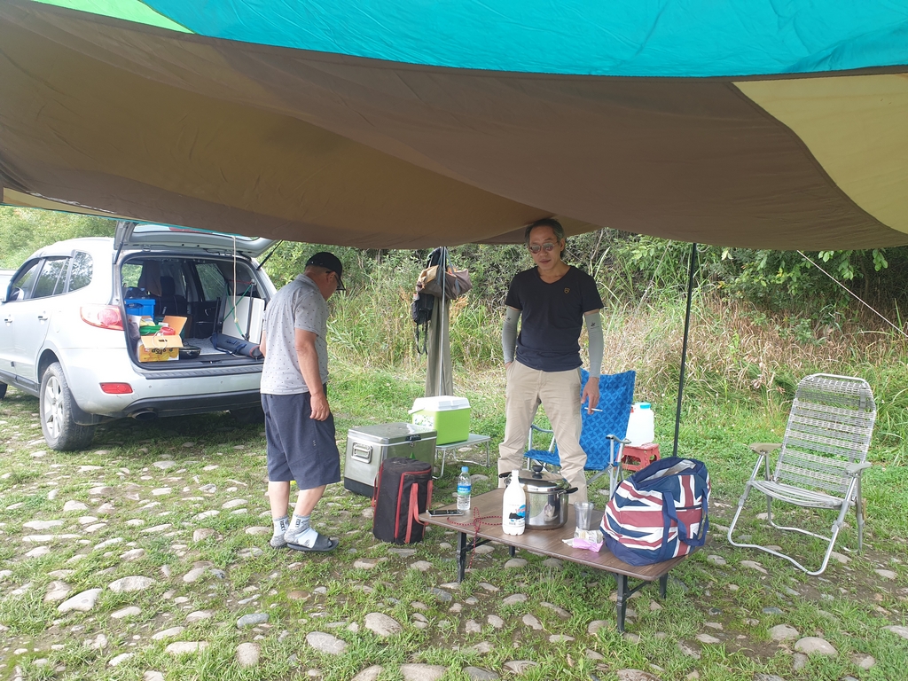전 날 과음하신 아버님게서 늦게 오셔서 일단 혼자 타프치고 자리깔아 놨습니다.
