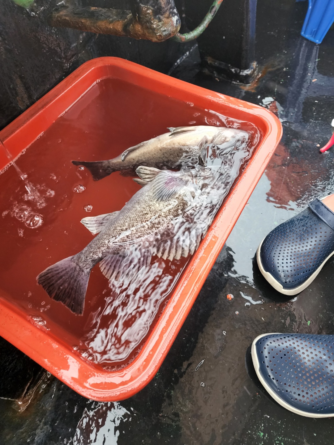 미끼로 빨간염색 오징어와 갯지렁이 입니다. 오늘 갯지렁이는 황해볼락만 너무 나와서 나중엔 오징어로만 했습니다. 둘이서 오전 반나절 낚시에 갯지렁이 1개 오징어 1개쓰면 적당 한거 같습니다. 고기가 오늘 잘 안나오네요. 선수쪽은 많이 나온거 같은데 선미쪽에 있는 우리는 많이 못잡았습니다. 그래도 둘이 먹고 남을 정도는 잡았습니다~ㅎㅎ