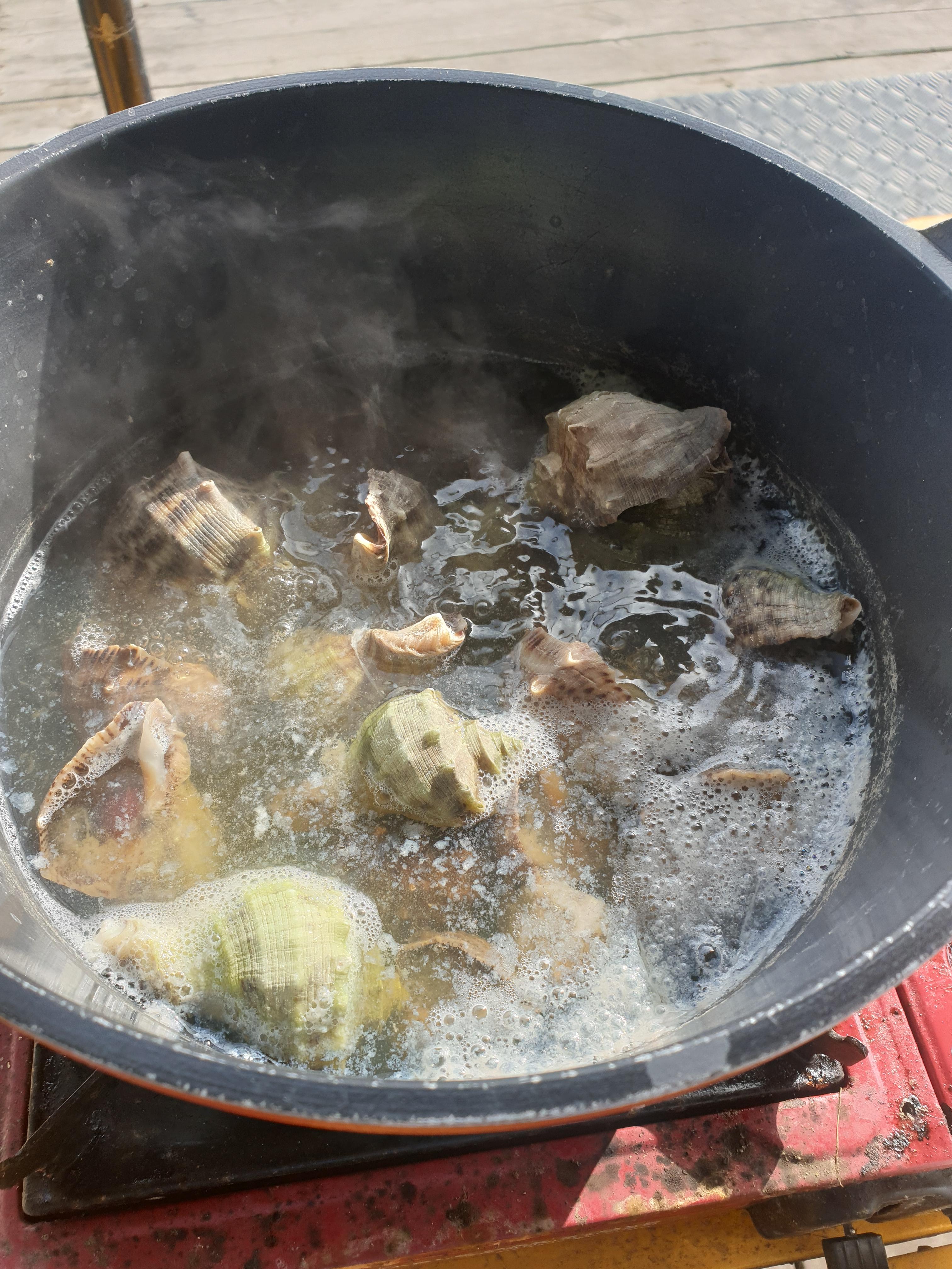 좌대 들어가는 배 기다리면서 같이 운영하시는 미조리수산에서 소라와를 사니 좌대들어가서 삶아 먹으라며
