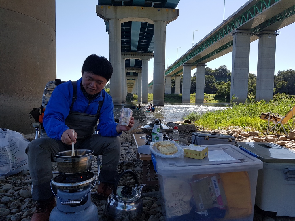 도착하자마자 제일 좋은 자리에 테이블 깔고 라면 한개 끓여 먹고 역시 제일 좋아보이는 자리에 수장대를 콱 박았습니다.