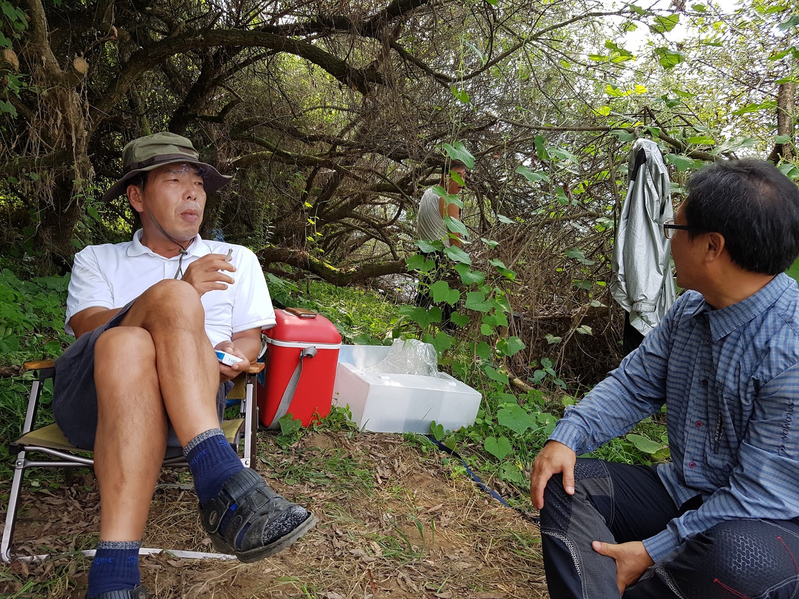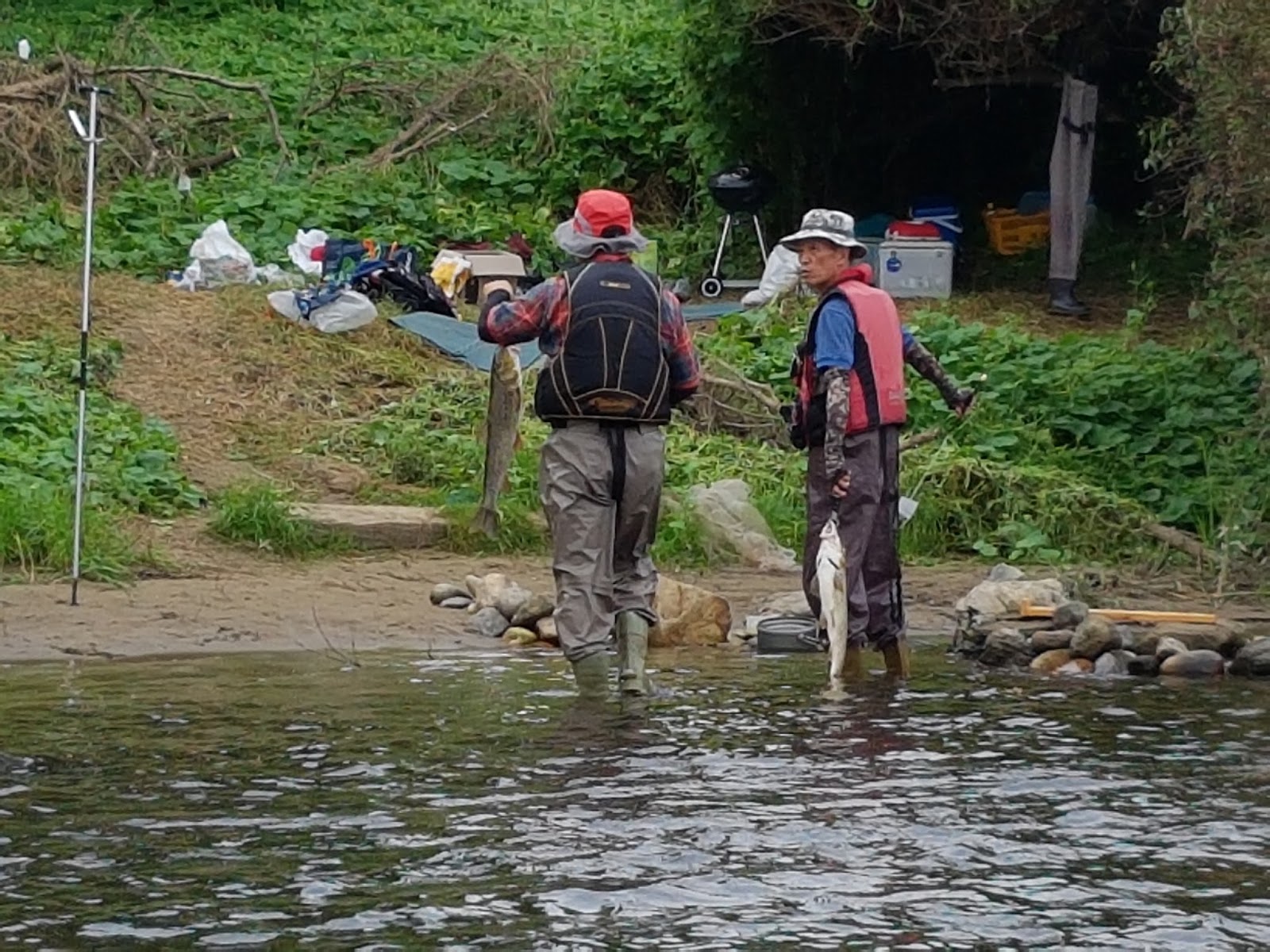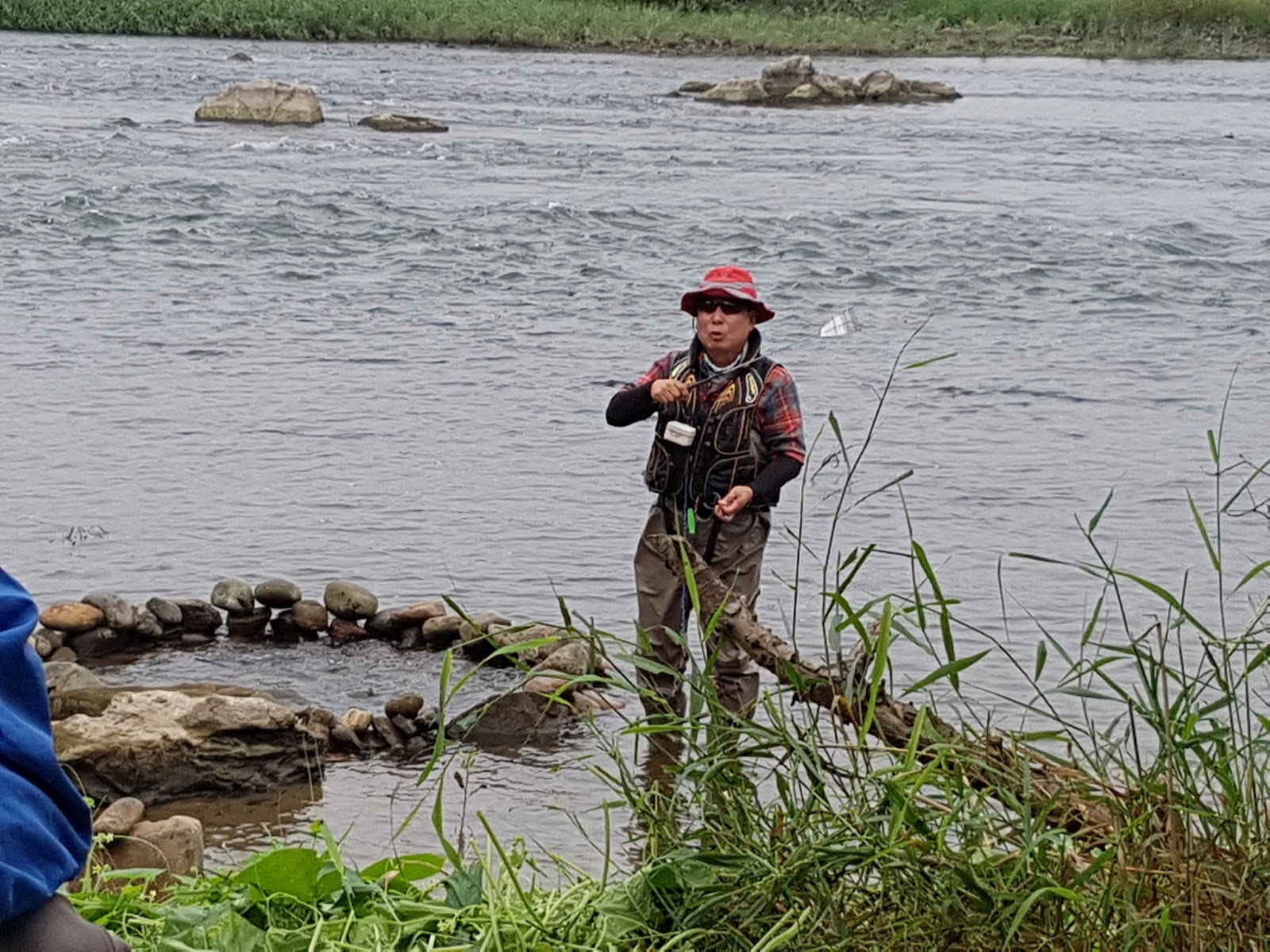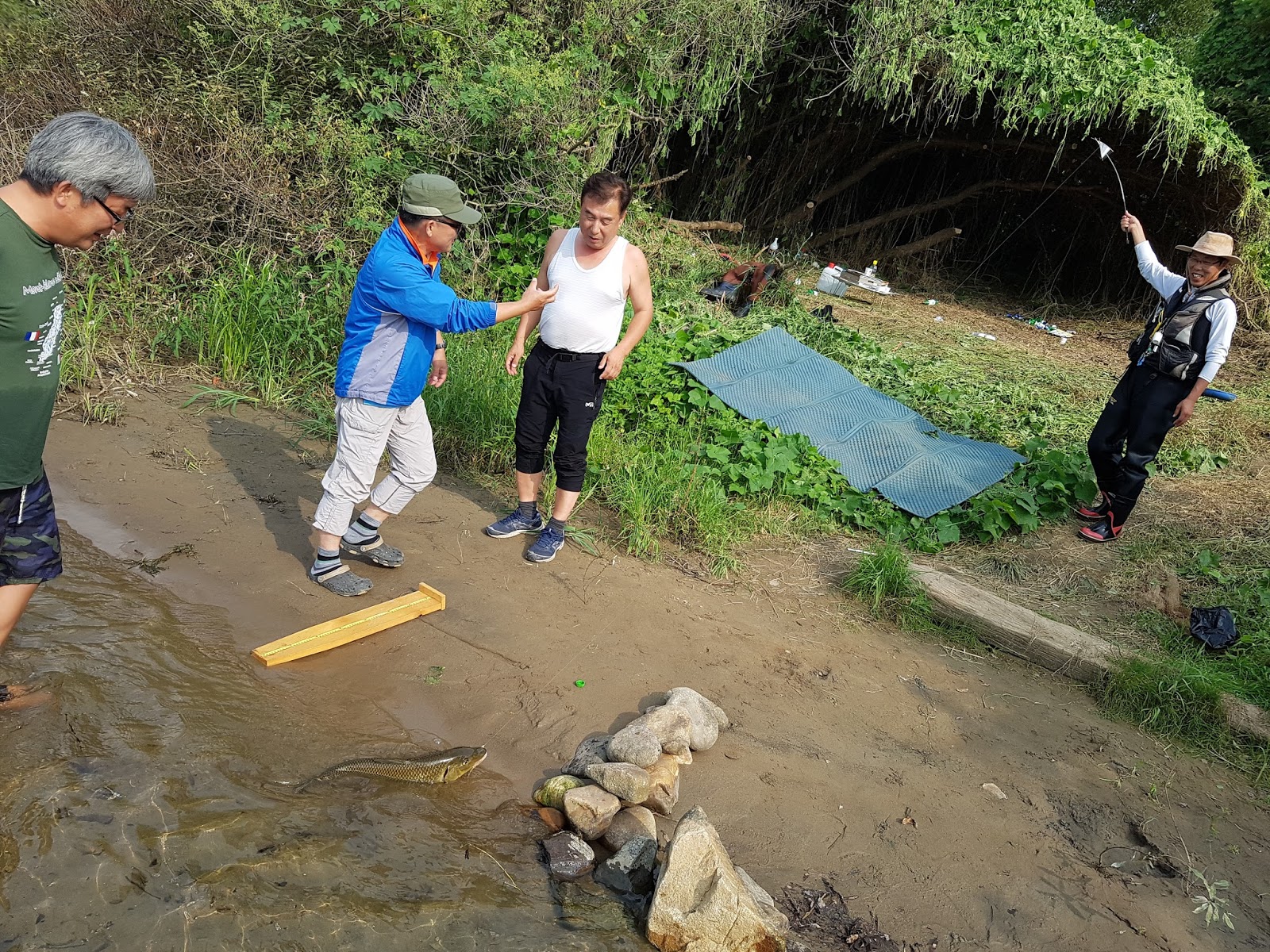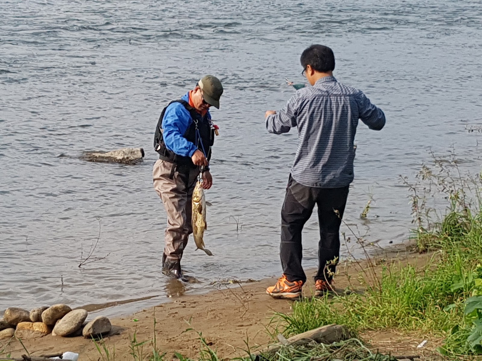 다리에 쥐나셔서 물에 못들어 가시는 짚멍석 선배님께 돌돌이 방장님께서 견지대를 넘겨주십니다. |